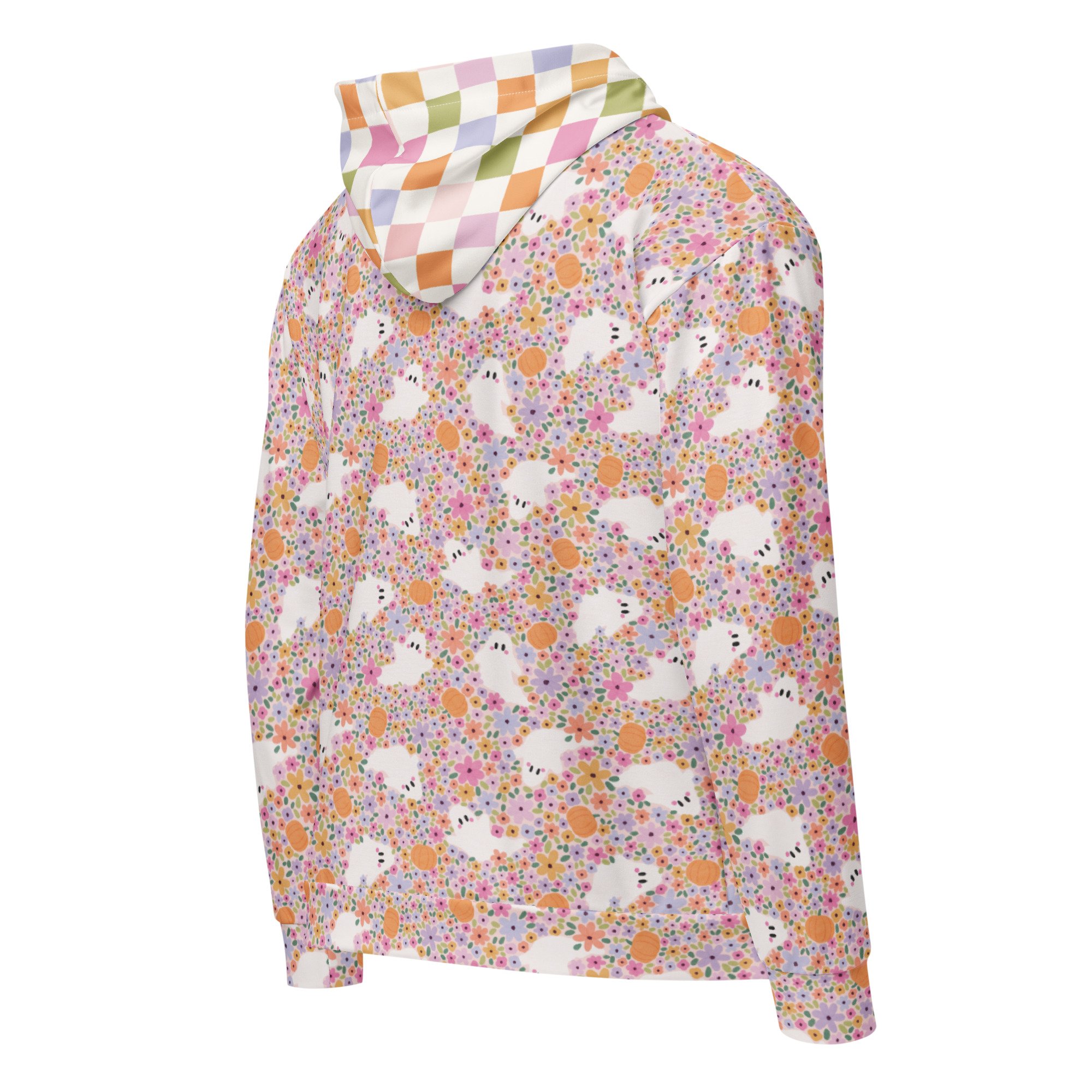 A playful mix of spooky and sweet—this pastel floral hoodie is sprinkled with happy little ghosts, pumpkins, and a patchwork touch. Soft colors, cozy vibes, and just enough Halloween spirit to wear all year long.